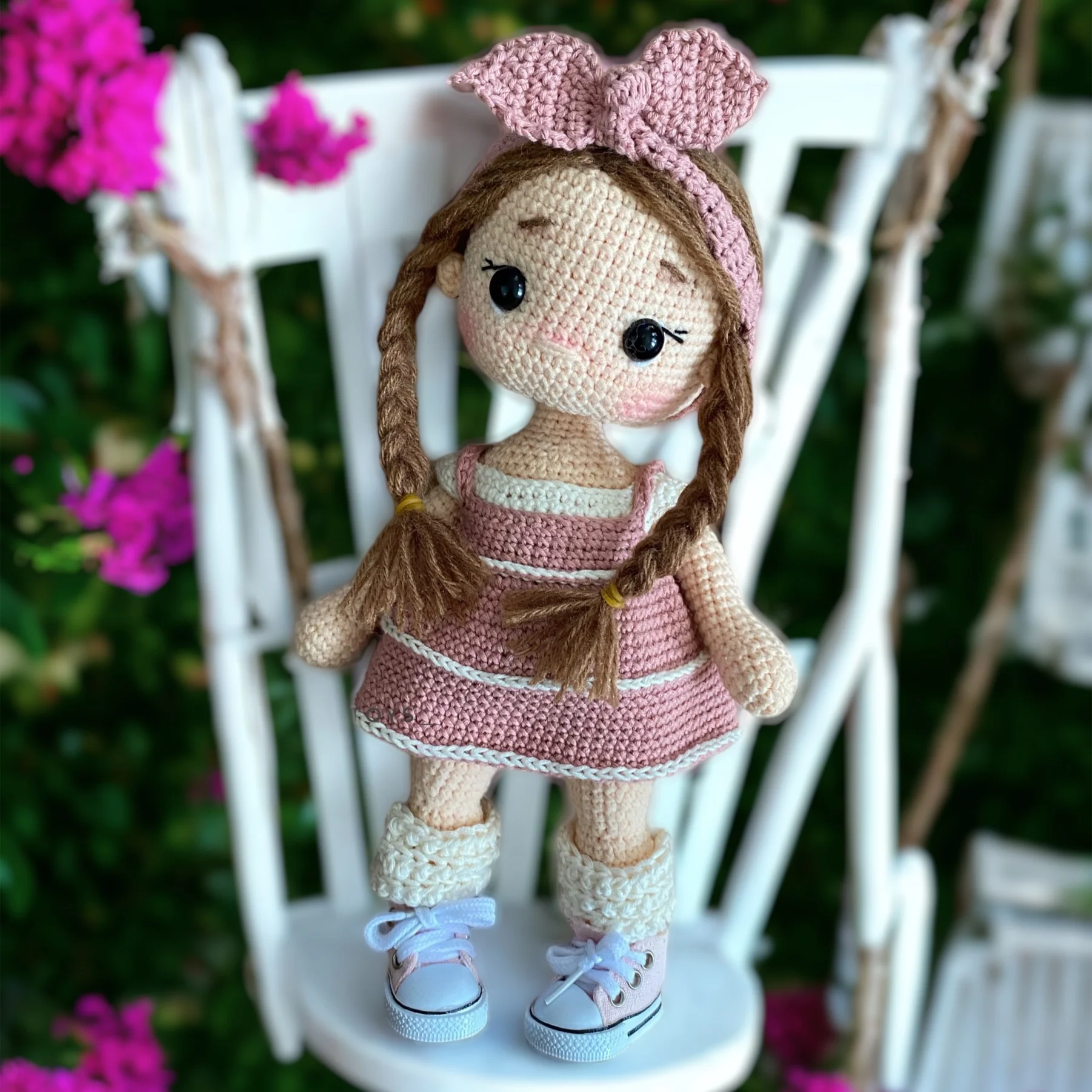 Wzór wykonania lalki przeznaczony jest dla osób średnio zaawansowanych. Wzór zawiera instrukcje jak połączyć nóżki lalki, jak zamontować stelaż, jak dołączyć rączki. We wzorze użyto podstawowych ściegów szydełkowych.